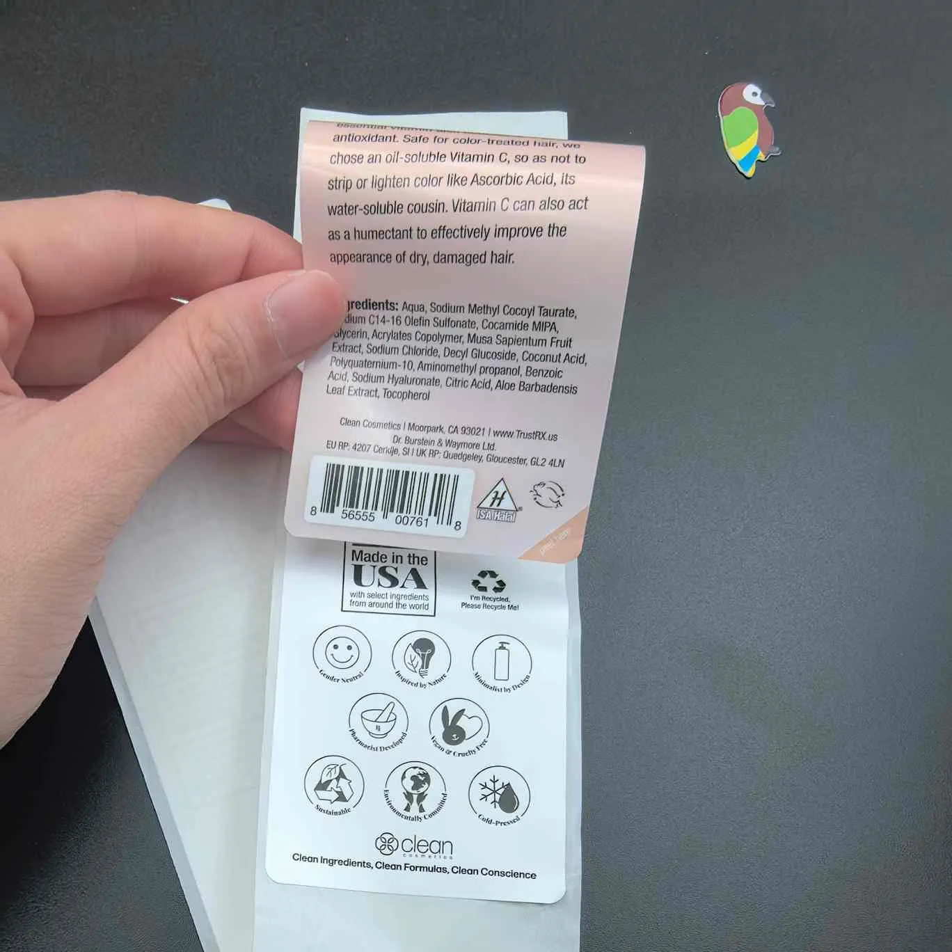 E: Kosmetikarako 2 geruza baino gehiago dituen etiketa da. Zuritu kanpoko geruza barruko geruzari buruzko informazio gehigarria erakusteko etiketaren tamaina zabaldu gabe.