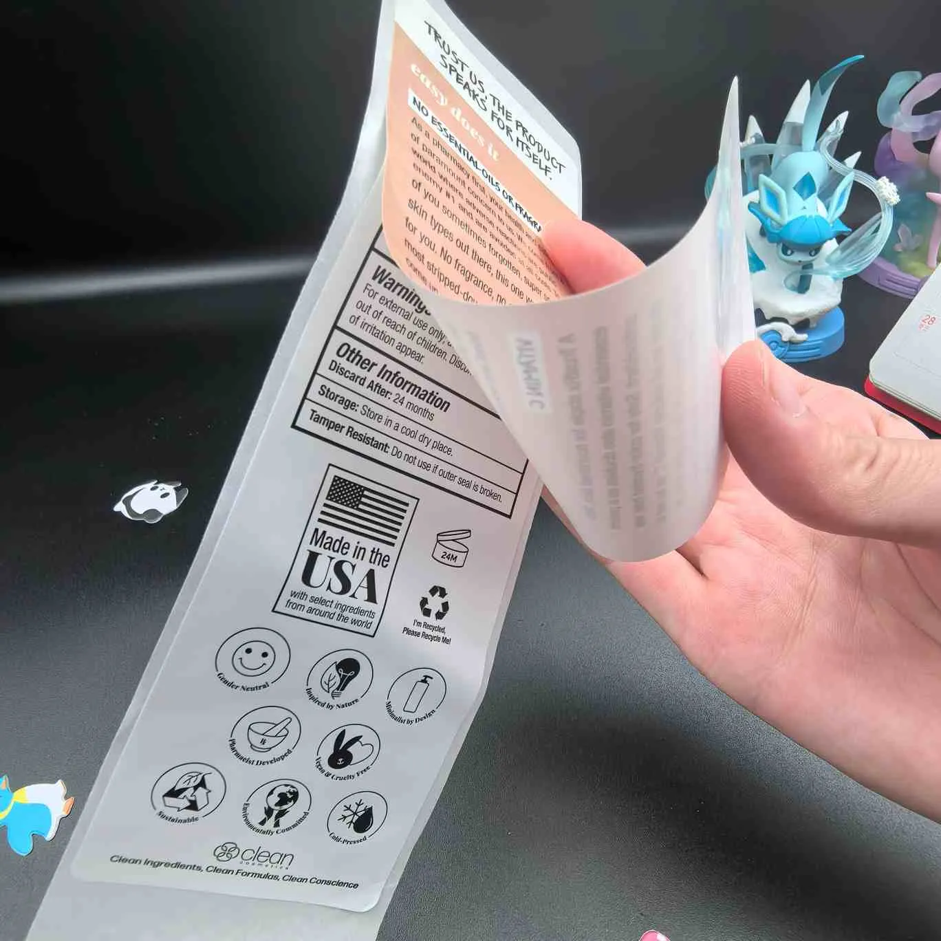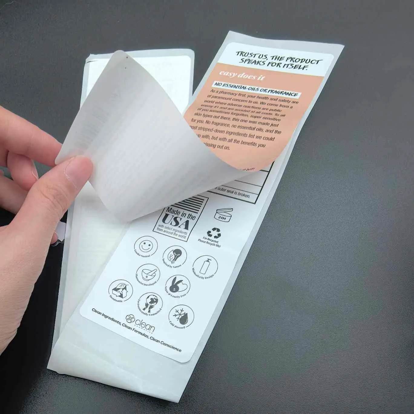 Etiketak zuritu eta irakurri:Mota oinarrizkoena, kosmetika-etiketetarako MultiLayer ere deitzen zaio. Goiko geruza erraz kentzen da eta barneko geruzak informazio hedatua dauka. Askotan aurpegiko maskarak, serumak eta ontziratutako beste produktu batzuetarako erabiltzen da.